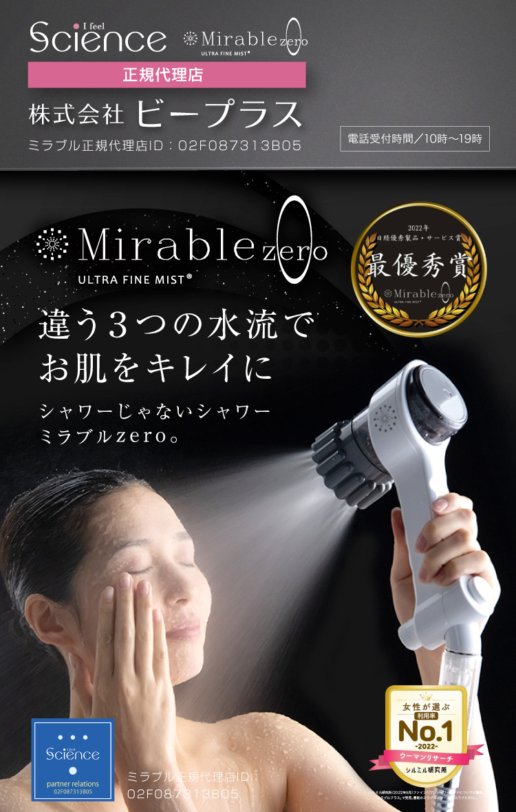 「ミラブルZERO」は、すぐれた洗浄力を持つウルトラファインバブルを含む水流を、 勢いのあるストレートと、より微細な気泡を毛穴まで届けるミストに ワンタッチで切り替えて使える画期的な「シャワーヘッド型美顔器」です。